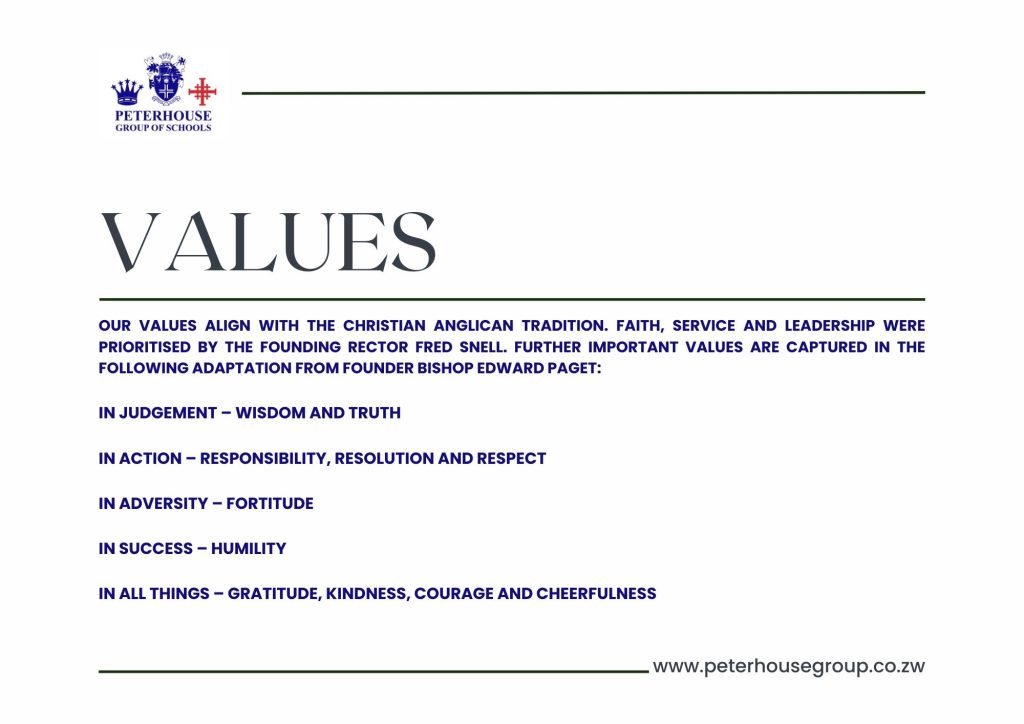 The Conference of Heads of Independent Schools in Zimbabwe (CHISZ) held its annual mini conference in Nyanga recent. CHISZ celebrates, this year, the 70th Anniversary of its foundation in 1956. A takeaway of the recent conference was a presentation by Chris Storey, a current Headmaster in South Africa, was an overview and reflection of “Living our Values in our Schools”. The relevance of this was not lost on Peterhouse having, as part of our recent strategic thinking, revisited our Mission, Vision and Values statements. Included in this Newsletter is our Values Statement which, in its construction, resonated with the message delivered at the recent Conference. In the next Newsletter we will share with you the Mission and Vision Statements.